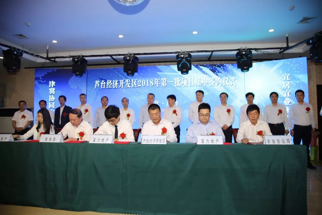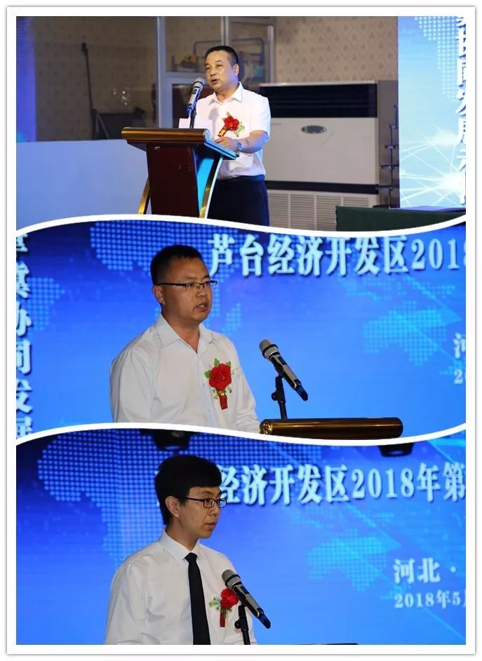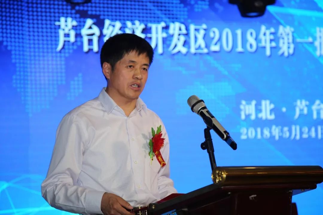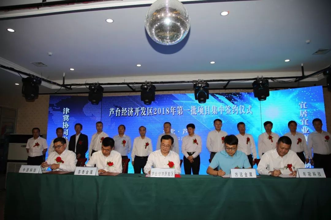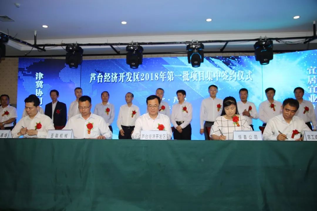 2018年5月24日,芦台经济开发区举行排名前列批项目集中签约仪式。唐山市政府副市长曹全民、市政府办公厅调研员孙友树出席仪式。