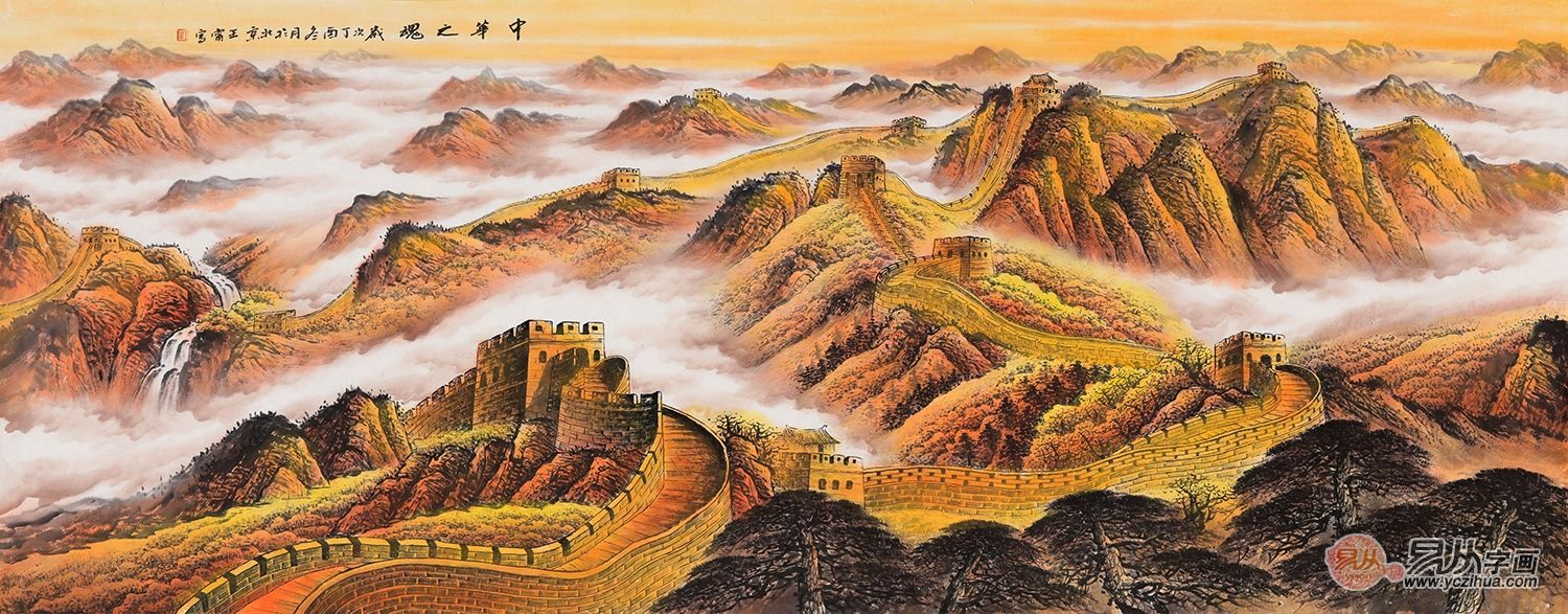 画家王宁的国画长城《中华之魂》,以金色为主色,描绘了中华民族精神的象征物万里长城的雄伟壮丽,画里长城驰骋纵横,气势宏伟,整个画面笔墨纵横,豪迈奔放,极尽山水画之精髓,从艺术角度再现了万里长城的宏伟风貌。